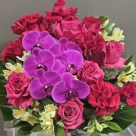 Ceramic arrangement of cymbidium orchids, antherium, Singapore orchids,lilys and mixed foliage